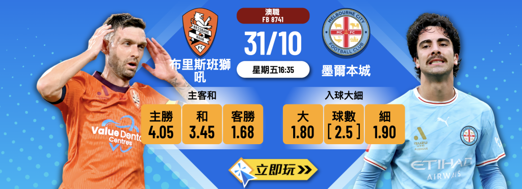 星期五澳職戰火重燃,將會上演一場矚目大戰,由主場的布里斯班獅吼迎戰衛冕冠軍墨爾本城 。今季嘅布里斯班獅吼 vs 墨爾本城戲碼絕對係充滿話題性,獅吼喺新帥華簡尼斯帶領下,力求擺脫上季頹勢,踢法大有改進;而客隊墨爾本城則延續上季王者霸氣,開季至今未嘗一敗,狀態如日中天 。綜合各方數據同球隊近況,今場賽事嘅脈絡相當清晰,客隊墨爾本城無論喺實力、往績定士氣上都佔盡上風,客勝似乎係不二之選。實發體育波膽將會為你深入拆解,點解墨爾本城係今場嘅信心保證。
