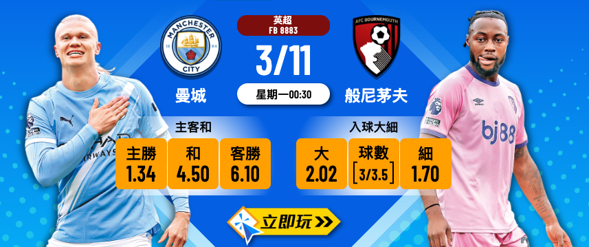 | 曼城 | 處於重建期,表現偶有不穩,但整體實力及攻擊力依然頂級。 | 艾寧夏蘭特 (入球保證) |